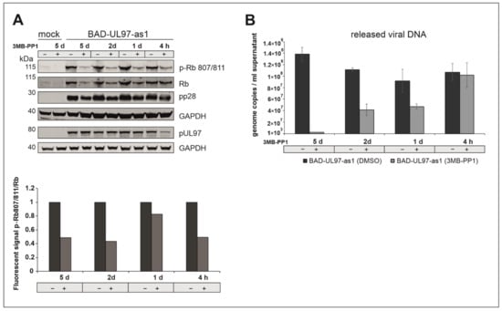 (A) BAD-UL97-as1 infected cells (10 genomes/cell) were harvested at 5 d.p.i. 40 µM of 3MB-PP1 was added at either 5 days, 2 days, 1 day or 4 h before harvest. The samples were analyzed by SDS-Page and Western blot analysis, using a specific antibody against the phosphosite 807/811 of Rb. The quantification was performed by measuring the protein intensity of pRb and Rb using Image Studio Lite Version 5.2.5. The ratios (pRb807/811/Rb) in dependence of 3MB-PP1 are shown. Thereby the corresponding DMSO sample was indicated as 1 (n = 2). (B) BAD-UL97-as1 (2 genomes/cell) infected HFFs were treated with 3MB-PP1 at different time points during infection. At 5 days, 2 days, 1 day or 4 h before harvest, the inhibitor was added. After 5 days post-infection, the supernatant was collected, DNA was isolated and the viral DNA of three technical replicates was quantified by TaqMan-PCR. The means ± standard deviations of each sample are shown.