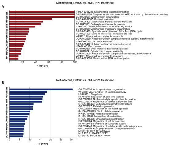 Dysregulated protein groups after 3MB-PP1 treatment in uninfected HFF. Pathway and process enrichment analysis of proteins up-regulated after 3MB-PP1 treatment (log2 ≥ 0.7 and p-value ≤ 0.05) (A). The top 20 clusters with their representative enriched terms are plotted according to their p-value in log base 10 (Log10 (P)). Enrichment analysis was performed with Metascape []. Pathway and process enrichment analysis of proteins down-regulated after 3MB-PP1 treatment (log2 ≤ −0.7 and p-value ≤ 0.05) (B). The top 20 clusters with their representative enriched terms are plotted according to their p-value in log base 10 (Log10 (P)). Enrichment analysis was performed with Metascape []. Pathway results are shown with the number of proteins found in the dataset and computed FDR for pathway enrichment (FDR < 0.001).