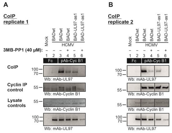 HFFs were cultivated in T175 flasks and used for infection with parental HCMV BADwt or recombinant BAD-UL97-as1 at a MOI of 0.5 for 4 d. An optional treatment with 40 µM of 3MB-PP1 (+, 3MB-PP1; −, DMSO solvent controls) was performed starting 4 h prior to sample collection and again during cell lysis. Total cell lysates were prepared and used for cyclin B1-specific CoIP with the indicated antibodies (see black boxes; Fc fragment was used as a negative control) under the continuous presence of 3MB. (A,B) show two independently produced biological replicates of this CoIP experiment, in order to illustrate the range of variability of individual signal strengths of detected protein bands. The CoIP samples were subjected to SDS-PAGE/Wb analysis (CoIP) and additional control stainings were performed to verify successful immunoprecipitation (cyclin IP control) and protein expression levels (lysate controls).