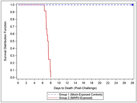 All statistical analyses were conducted using SAS® (version 9.4) on the 64-bit platform or R. (version 3.6.3). All results are reported at the 0.05 level of significance. Mortality rates and exact 95% confidence intervals were calculated for each group using Clopper-Pearson 95% confidence intervals. A one-sided Boschloo’s test was performed to assess whether mortality outcome in the MARV-exposed group was greater than that of the mock-exposed control group. Time to death data were analyzed and compared between the MARV-exposed and the mock-exposed control groups. Kaplan–Meier curves were plotted, and median times to death were estimated with 95% confidence intervals. A log rank test was used to determine if there was a significant difference between the groups. All animals were included in the analysis; those surviving to end of study (termination on Day 28) were censored at the time of terminal sacrifice.