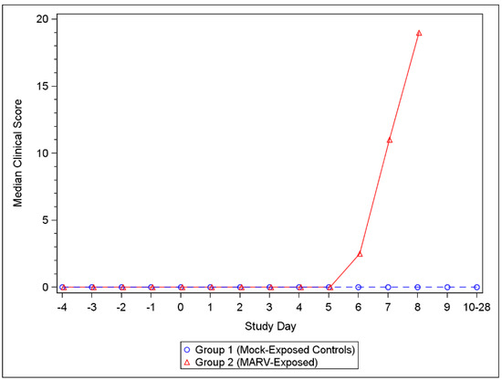 All MARV-exposed animals were euthanized or succumbed to disease; there were no survivors after Day 8 (Figure 1). The mock-exposed NHPs lived to the end of the study (Day 28). A one-sided Boschloo’s Test showed a significant difference in mortality between the two groups (p < 0.0001). The median time to death for the MARV-exposed NHPs was 175.55 h (7.3 days).