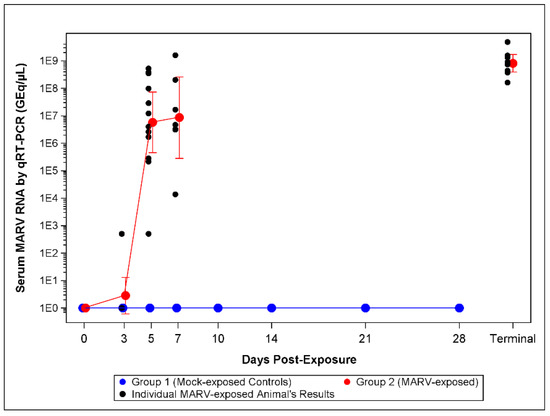 On the day of collection, harvested serum (0.05 mL) was added to TRIzol® LS (5X volume; i.e., 0.25 mL) and stored at ≤−65 °C until RNA exaction. RNA was extracted from samples using the Zymo Research Direct-zol™ RNA MiniPrep kit (Zymo Research, Irvine, CA, USA). For sample quantification, each assay plate contained a standard curve prepared using MARV VP40 gene synthetic RNA (1.0 × 103 to 1.0 × 1010 genome equivalents/µL [GEq/µL] in duplicate wells). For the qRT-PCR, QuantiFast Probe RT-PCR Master Mix and QuantiFast RT Mix (Qiagen, Ilden, Germany) were used in conjunction with Forward primer: 5′- CCAgTTCCAgCAATTACAATACATACA-3′, Reverse primer: 5′- gCACCgTggTCAgCATAAggA-3′ and Probe: 5′-6FAM- CAATACCTTAACCCCC-MGBNFQ-3′. Primers and probe targeted the VP40 gene from MARV (GenBank accession no. DQ447660). The qRT-PCR was conducted on a Bio-Rad CFX96TM Real-Time PCR.