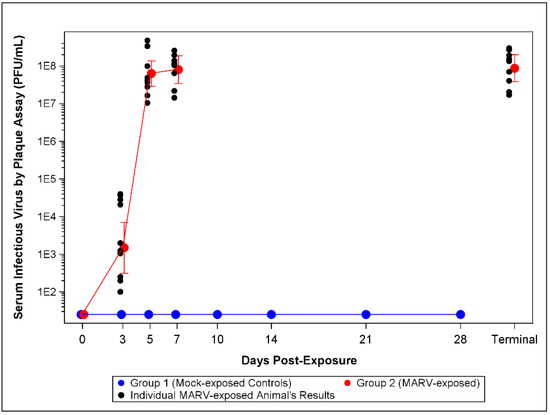 Plaque Assay Viremia Titers. The LLOD for the assay is 50 PFU/mL. For statistical analysis and graphing LLOD samples were assigned 25 PFU/mL. The symbols represent geometric mean concentrations and bars indicate 95% confidence intervals. The confidence intervals on Days 0 through 28 for mock-exposed control animals, and on Day 0 for MARV-exposed animals were not plotted as the results were constant and all below LLOD of 50 PFU/mL.