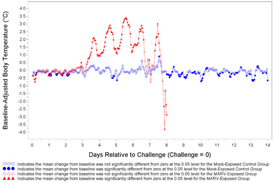 Body temperatures were recorded every 15 min via implantable loggers which were removed during necropsy and data downloaded (Figure 5). There were many statistically significant increases and decreases from baseline body temperature for both MARV-exposed animals and mock-exposed control animals as depicted in Figure 5. The temperature shifts were mostly below the baseline on Days 1 and 2 and mostly above the baseline between Days 3 and 8 for MARV-exposed animals. The MARV-exposed NHPs showed a marked increase in body temperature ranging from 1–3.5 °C above baseline starting on Day 3 post-infection. The increase in body temperature continued until the animal met euthanasia criteria or succumbed to infection.