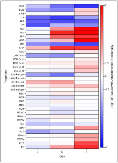 Heat Map of Statistical Differences between the MARV-Exposed and Mock-exposed Groups. Heatmap indicating mean increases (red) or decreases (blue) in MARV-exposed group in comparison to mock-exposed control group, based on log-transformed p-values adjusted for directionality. Significant differences indicated for values >1.3 or <−1.3, where log10(0.05) = 1.3.