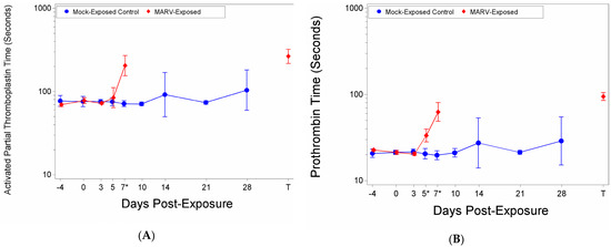 It is important to note that at the terminals time point, only two NHPs in the MARV-exposed group clotted within the 300 s time limit for the aPPT assay and 100 s limit for the PT. The out-of-range samples were assigned 300 (aPTT) or 100 (PT) seconds for statistical analysis and graphing purposes.