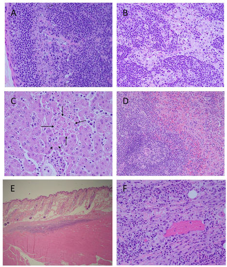 Histopathology Findings in MARV-exposed Cynomolgus Macaques. Cortex (A) and medulla (B), inguinal lymph node, extensive lymphocyte apoptosis. Liver (C), hepatocyte apoptosis (long arrows) and hepatocyte intracytoplasmic inclusion bodies (short arrow). Spleen (D), extensive lymphocyte apoptosis in white pulp and red pulp. Challenge site with mild inflammation (E). Higher magnification of challenge site (F), apoptosis of inflammatory lymphocytes. Photographs are representative.
