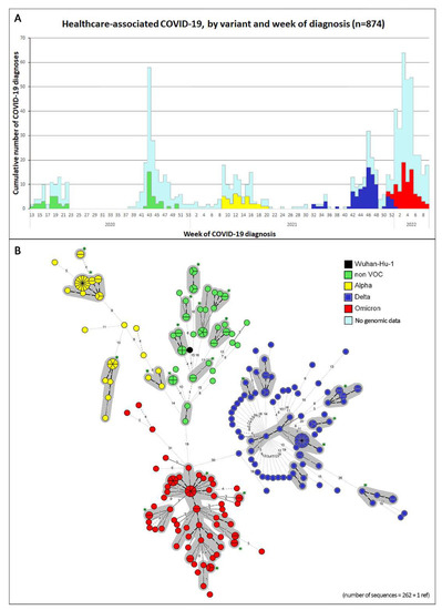 Figure 2A shows the 269 HAI cases and the 605 aHCWs taken together (n = 874) over time on the epicurve, color-coded according to the viral strain. Figure 2B shows the MST of the sequenced samples (n = 262), color-coded by the type of SARS-CoV-2 strain. The genomic clusters are highlighted by the contoured circles in grey.