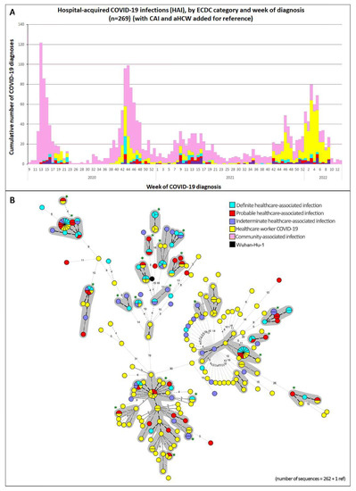 Many articles have described community-associated COVID-19 (CAI) patients from the beginning of the pandemic onwards [1,10]. Fewer have focused on HAIs, despite the burden and risks associated with HAIs [11]. We decided, therefore, to study our healthcare-associated cases (HAIs and aHCWs) using different approaches: clinical, epidemiological, and genomic [12,13,14].