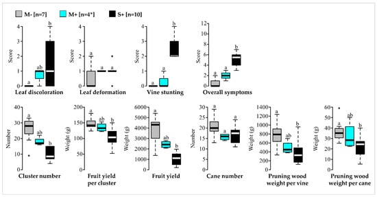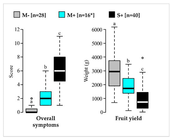 Comparison of overall symptom scores and fruit yields over four years for vines in M−, M+ and S+ categories. Results for vines in the M− (in grey), M+ (in cyan) and S+ (in black) categories are shown. Boxplots show the median (horizontal bold line) and the interquartile range with lonely dots representing extreme data. Different letters (a,b,c) indicate significant differences (p ≤ 0.05). Raw data and results of the statistical tests are available in Tables S1 and S3, respectively. Number of vines (n) is given in brackets. * For the M+ category, 15 replicates were considered for overall symptom scores.