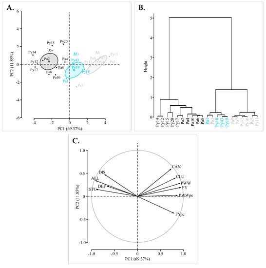Principal components analysis (PCA) and hierarchical clustering of 21 vines according to their mean symptom scores and yield values over the four-year study (from 2016 to 2019). (A) Biplot representing the ‘M−’ (grey), ‘M+’ (cyan) and ‘S+’ (black) individuals. Projection of M−, M+ and S+ categories are represented by squares with their confidence ellipses (95%). (B) Dendrogram representing the hierarchical clustering based on the individuals coordinates on the 10 principal components. (C) Loading biplot, the vectors show the relative importance of each variable in discriminating amongst the observations. Longer vectors indicate greater contribution. Vectors point in the direction they ordinate the observations (DIS: Leaf discolouration, DEF: leaf deformation, STU: vine stunting, ALL: overall, CLU: cluster number, FY: fruit yield, FYpc: fruit yield per cluster, CAN: cane number, PWW: pruning wood weight per vine, PWWpc: pruning wood weight per cane). Results of the Fisher’s test are available in Table S4.