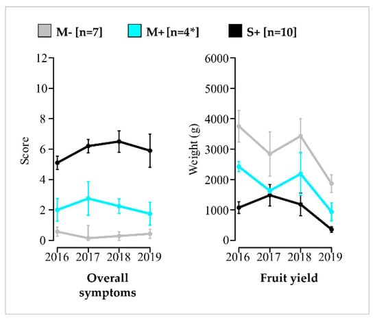 Regarding phenotypic traits evolution from 2016 to 2019, the annual mean values of M+ vines ranged each year between values obtained for vines in the M− and S+ categories, illustrating a steady pattern. This trend was observed for overall symptoms, fruit yield (Figure 3) and other traits (Figure S4). Therefore, each category of vines remains constant along the study.