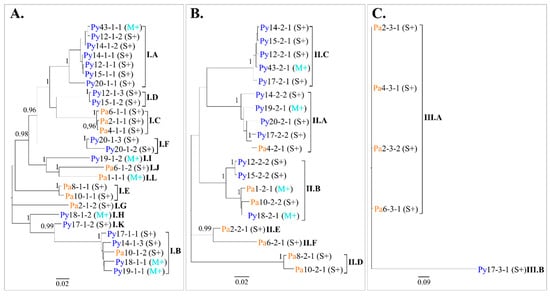 Phylogenetic relationships between grapevine fanleaf virus (GFLV) molecular variants. Maximum likelihood trees were inferred from the complete nucleotide sequences of ORF1 (A), ORF2 (B) and ORF3 (C) recovered from GFLV-infected ‘Chardonnay’ vines. Each sequence name indicates the vineyard site (Pa, in orange and, Py, in deep blue), the sampled vine, the molecular variant and the vine affiliation to a phenotypic category (M+, in cyan and S+, in black) in parenthesis. Clades are named with the Roman numeral corresponding to the GFLV ORF and classified from the most [A] to the least [L] represented clade in sequence number. The names of the distinct clades are highlighted in bold. Sequence variants sharing at least 95% nucleotide identity were considered in the same clade; pairwise nucleotide identities values between GFLV sequences are available in Table S6. Scale bars below each tree show genetic distance. Only bootstrap values ≥ 0.95 are indicated.
