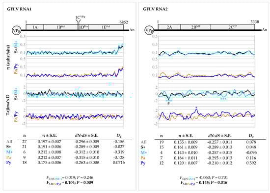 Genetic diversity (π) values were calculated in MEGA7 software using the best-fit ML model determined for each dataset (TN93 + G for ORF1, ORF2, 1BHel and 1EPol; K2 + G for 1A, 1CVPg, 2A and 2BMP; T92 + G for 1DPro and 2CCP) and bootstrapping analyses of 100 replicates were performed. π and Tajima’s D (DT) sliding window analyses were conducted in DnaSP v6.12.03 [58] with window length of 100 nts and step size of 25 nts parameters. The difference between non-synonymous (dN) and synonymous (dS) substitutions over the coding sequences of GFLV populations was estimated by the Kumar method in MEGA7 software. GFLV populations were compared by calculating the fixation index (FST) in Arlequin v3.5.2.2 [59] using the above-mentioned models. Significance of the differences was obtained by performing 1000 permutations. Finally, potential recombination events were estimated by using RDP4 and the default settings of the seven algorithms: RDP, GENECONV, BootScan, MaxChi, Chimaera, SiScan and 3Seq [60]. Only recombination events detected by five or more methods were considered.