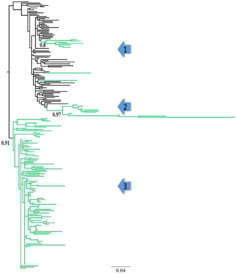 - Drummond, A.J.; Rambaut, A. BEAST: Bayesian evolutionary analysis by sampling trees. BMC Evol. Biol. 2007, 7, 214. [Google Scholar] [CrossRef]