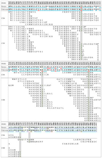 In the next step, we evaluated the effects of mutations (the amino acids dissimilar between Pakistani and Kenyan sequences (303, 332, 357, 370, 372, 375, and 383)) on CTL and helper T-cell epitope generation (Figure 4). The number of identified epitopes between Kenyan (CD4+ = 7 and CD8+ = 27) and Pakistani (CD4+ = 4 and CD8+ = 15) consensus sequences differed due to amino acid polymorphisms in epitope regions. For example, the presence of threonine (T) at amino acid position 303 in the Kenyan sequence matched five CD4+ and ten CD8+ T-cell epitopes, respectively (Figure 4). In contrast, a valine (V) in this position in the Pakistani sequence only matched two CD8+ T-cell epitopes (Figure 4). In contrast, some signature variations resulted in the prediction of CD4+ T-cell epitopes in Pakistani sequences only, such as sites 332 and 370, which matched two and one CD4+ T-cell epitopes, respectively (Figure 4). Moreover, amino acid site 375 in the Pakistani strain was represented by two CD8+ T-cell epitopes, whereas the same site in the Kenyan strain did not match any previously described epitopes (Figure 4).