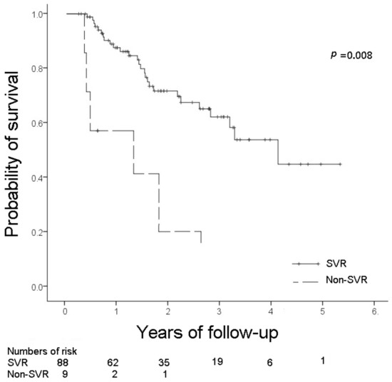 The survival outcomes stratified by SVR and non-SVR are shown in Figure 1. The 1-year and 2-year OS rates were significantly higher in the SVR group than those seen in the non-SVR group (1-year: 87.5% vs. 57.1%, p = 0.003; 2-year: 71.1% vs. 28.6%, p = 0.012). The median OS of the patients with SVR and those with non-SVR to DAA therapy was 4.17 and 1.25 years, respectively. The difference was significant (p = 0.008). None of the patients with non-SVR to DAA therapy survived longer than 3 years.