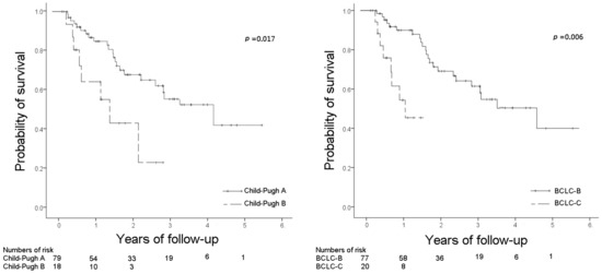 Regarding the patients with SVR, analysis of the association between Child–Pugh stage or BCLC stage and OS is displayed in Figure 2. The patients in Child–Pugh stage A, compared with those who were in Child–Pugh stage B, experienced significantly better OS (p = 0.017). The 2-year OS rate in the patients with Child–Pugh stage A and B was 72.1% and 51.1%, respectively (p = 0.002). In addition, the patients in BCLC stage B, compared with those who were in BCLC stage C experienced significantly better OS (p = 0.006). The 1-year OS rate of the patients with BCLC stage B and C was 91.4% and 60.0%, respectively (p = 0.058). None of the patients with BCLC stage C HCC survived more than 2 years.