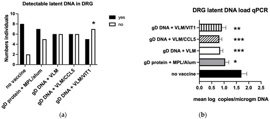 Each guinea pig was examined daily and scoring conducted for primary genital skin disease. The scoring scale was from 0 to 4, with 0 indicating no disease, 1 for reddening or swelling, 2 for one to three small vesicles, 3 for more than three vesicles, large merging lesions and 4 for several large ulcers with maceration [39,40]. Animals were also evaluated daily from days 14–63 post virus challenge to detect any recurrent herpetic lesions. Recurrent shedding of virus was determined by vaginally swabbing animals three times per week. The swabs were stored at −80 °C until processed for PCR analyses as a marker for virus shedding. At the completion of the study, the guinea pigs were sacrificed, and both dorsal root ganglia (DRG) and spinal cords removed aseptically, and stored at −80 °C prior to DNA extraction for evaluating by PCR for evidence of latent virus infection.