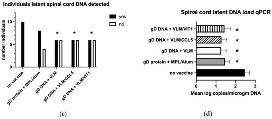 As the immunisations protected against acute disease and virus replication, the effects on establishment of latency were then examined. Only the VLM DNA immunisations significantly reduced the number of animals with detectable latent DNA in the DRG and overall reduced viral load (Figure 5a–d). In contrast, the gD protein vaccine did not significantly reduce detection of latent DNA in either the DRG or the spinal cord. Over half of the animals treated with gD DNA + VLM/VIT1 were protected, in that no detectable HSV-2 DNA was recovered in the DRG, compared to 80% detection in the no vaccine animals (Figure 5a). Analyses of the total mean DRG loads showed all vaccines significantly reduced HSV-2 DNA levels compared to no vaccine, with the gD DNA vaccines reducing the HSV-2 DNA by approximately 50% (Figure 5b). Analyses of latent DNA detected in the spinal cord showed mostly similar effects to the DRG. While all the vaccine treatments significantly reduced latent viral DNA load detected in the spinal cord, only the gD VLM DNA vaccine, and not the gD protein immunisation, had significantly reduced numbers of animals with detectable DNA in the spinal cord (Figure 5c,d).
