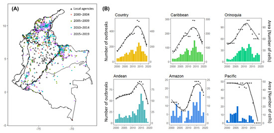 Spatial and temporal distribution of VBR outbreaks in Colombia from 2000 to 2019: (A) Locations of VBR outbreaks across the five biogeographic regions of Colombia. Point colors illustrate the five-year periods of outbreak occurrence. Triangles represent the local reporting offices of the ICA’s national rabies surveillance system; (B) Bars represent the total number of VBR outbreaks per year. Points correspond to the estimated annual infected area, expressed in number of cells. The number of cells was estimated as the sum of cell grids with a density level higher than the 95th percentile value (i.e., density = 0.01) from a Kernel estimation choosing a bandwidth = 0.01 and a grid = 200 × 200 cells. Lines (black) represent the model prediction tendency estimated using the method ‘loess’ in the geom_smooth function of the ggplot2 in R. Each plot represents estimates at the country or biogeographic region level.