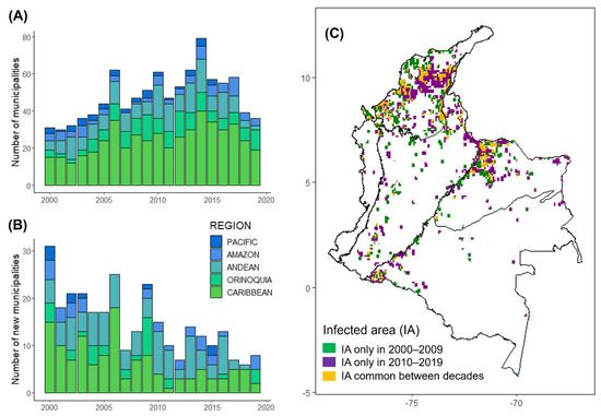 Annual number of municipalities and infected areas in Colombia from 2000 to 2019: (A) Bars represent the annual number of municipalities reporting VBR outbreaks; (B) Bars represent the annual number of ‘new municipalities’ reporting VBR outbreaks for the first time. Each bar division illustrates a biogeographic region; (C) Comparison between the infected area (IA) in the second (2010–2019) and the first (2000–2009) decade of the study. ‘New infected areas’ were considered as cells reporting VBR outbreaks in the second decade that did not report outbreaks in the first decade (cells in purple), whereas cells reporting outbreaks in both decades were considered as ‘endemic areas’ (cells in yellow). The infected area was estimated using a bandwidth = 0.01 that generated a 10 km2 radius.
