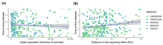 Influence of significant biotic and abiotic conditions on the time of arrival of the first VBR outbreak at each municipality: (A) Correlation between the time of the first outbreak (e.g., number of years since 2000) in a municipality and its cattle population. Total livestock population was tested in a different model instead of ‘number of cattle’ without statistical significance (glmmPQL: Estimate = −1.2 × 10−6, p-value = 0.12). Each point shape represents a biogeographical region; (B) Correlation between the time of the first outbreak in a municipality and the geographical distance of that outbreak to the closest reporting office. Lines (blue) represent the tendency estimated for the model and the shadow represents the confidence interval (CI = 95%, grey) estimated using the method ‘lm’ in the geom_smooth function ggplot2 in R.