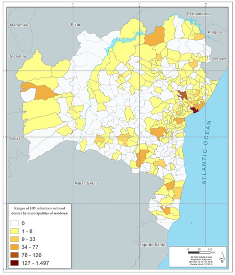 Figure 1, Figure 2, Figure 3 and Figure 4 represents the geographic distribution of the HIV infected blood donors identified in Bahia by municipality (Figure 1), HTLV (Figure 2), HCV (Figure 3) and HBV (Figure 4) in the last 10 years in the state of Bahia, by municipality of residence of the donors. Regionally, donors from the Metropolitan Region of Salvador had the highest infection rate (54.5%) and donors from São Francisco Valley had the lowest infection rate (2.8%).