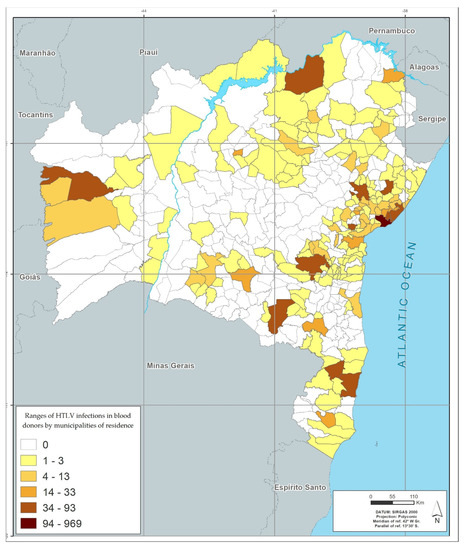 Infection’s rates in absolute numbers for HTLV by municipalities of residence in blood donors between 2008–2017.