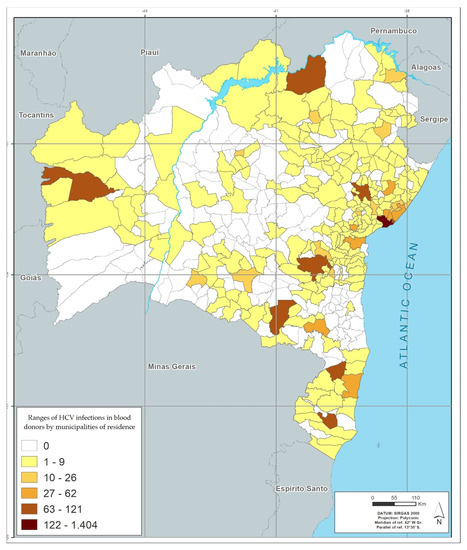 Infection’s rates in absolute numbers for HCV by municipalities of residence in blood donors between 2008–2017.