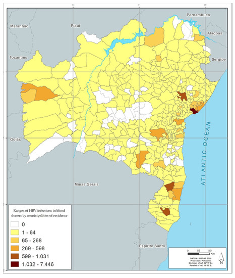 The georeferenced distribution of viral infections studied here shows the areas with the highest infection’s rates according to the city of residence of donors. The greater HIV positivity in the metropolitan region of Salvador may reflect aspects related to the highest population concentration in the state, but may also reflect behavioral aspects, which are often difficult to identify. For the other viruses, the predominance of infection in donors residing outside the state capital, with areas of peak in certain regions (example: higher rate of HBV infection in the south of Bahia, an area with high tourist traffic) may also reflect local behavioral aspects and for HBV, a low vaccination coverage.