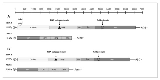 Hypothetical genome organization of alpine wild prunus virus-P. brigantina (AWPV-Pb) (A) and of stocky prune virus (StPV) (B). Putative cleavage sites of RNA1 and 2 deduced polyproteins are represented by dashed lines. The conserved motifs of helicase and RNA-dependent RNA polymerase (RdRp) are shown by black triangle and hatched circle, respectively. The position of the indel of 138 nt in AWPV-Pb RNA1 in comparison to AWPV-Pm RNA1 is shown. Co-Pro: protease cofactor; NTB: nucleotide triphosphate binding helicase; VPg: viral genome-linked protein; Pro: protease; Pol: polymerase; MP: movement protein; CP: coat protein. RdRp: RNA-dependent RNA polymerase.