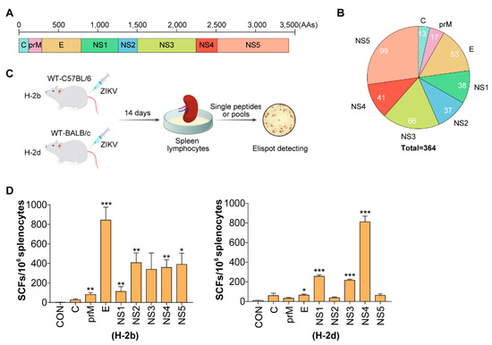 To identify the specific peptides and epitopes of ZIKV in C57BL/6 (H-2b) and BALB/c (H-2d) mice, we designed 364 overlapping peptides from the full-length sequence (3423 amino acids) of ZIKV. Peptides (20-mer) that overlapped by 10 amino acids were synthesized to ensure that shorter peptides (e.g., 8 to 11-mers) were represented in at least one peptide (Figure 1A,B). Next, we tested T-cell responses to the ZIKV protein libraries mixed with peptides from proteins using IFN-γ-ELISPOT assays in H-2b and H-2d mice infected with ZIKV for 14 days (Figure 1C). Robust T-cell reactions can be observed in H-2b mice against E, NS2, NS3, NS4 and NS5 protein libraries, while NS1, NS3, and NS4 protein libraries can induce strong T-cell reactions in H-2d mice (Figure 1D).