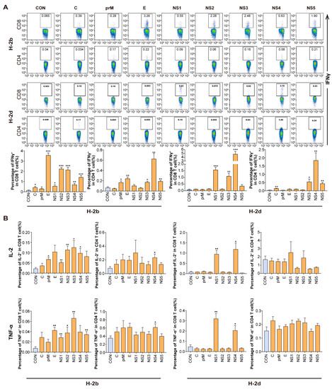 To further validate the profile of the immune reaction to these ZIKV-derived protein libraries, intracellular cytokine staining (ICS) was performed. Splenocytes were stimulated with all eight protein libraries and the frequency of IFN-γ/TNF-α/IL-2-producing CD8+ and CD4+ T cells was determined. E, NS2, NS3 and NS5 protein libraries induced a high frequency of IFN-γ-expressing CD8+ T cells, while, E and NS4 induced a high frequency of IFN-γ-CD4+ T cells in H-2b mice (Figure 2A). In H-2d mice, NS1, NS4 protein libraries induced the highest expression of three cytokines (IFN-γ, IL-2 and TNF-α) in CD8+ T cells, which was similar to the ELISPOT assay results, while NS4 induced the highest IFN-γ-expressing CD4+ T cells (Figure 2A,B). Thus, generally, ZIKV E protein in H-2b mice, and NS1 and NS4 in H-2d mice were the dominant antigens for inducing a high frequency of IFN-γ-expressing CD8+ T cells, while NS4 for both mouse alleles dominate the IFN-γ-expressing CD4+ T cell responses. These results demonstrated distinct dominance features of ZIKV protein libraries to induce virus-specific CD8+/CD4+ T cells among different mouse alleles.