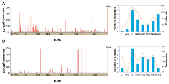Mapped peptides according to location in the ZIKV polyprotein of H-2b and H-2d mice. Wild-type C57BL/6 and BALB/c mice were infected with 104 FFU of ZIKV, splenocytes were harvested at 14 d.p.i. and stimulated with the indicated matrix peptide pools. A total of 364 peptides were screened by IFN-γ-ELISPOT assays, with PMA as a positive control. (A,B) Left shows SFCs of 364 peptides distributed in the ZIKV polyprotein in H-2b (A) and H-2d (B) mice (n = 3 per peptide). Right shows the number of positive peptides for each protein, SFCs ≥ 40 in H-2b means positive.