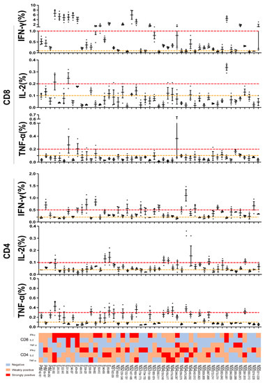 Peptides immunothermogram analysis of CD8+/CD4+ T cell in H-2b and H-2d mice. Wild-type C57BL/6 (H-2b) mice were infected with 104 FFU of ZIKV, splenocytes were harvested at 14 d.p.i. and stimulated with above-positive peptides to assess cytokines production by ICS. The percentages and heat map analysis of IFN-γ, TNF-α and IL-2 produced in CD8+/CD4+T cells in H-2b and H-2d mice (n = 3 per peptide). Dashed lines between red and yellow are weakly positive, beyond red are strongly positive.