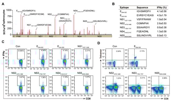 Identification of ZIKV epitopes recognized by CD8+ T cells in H-2b mice. Wild-type C57BL/6 (H-2b) mice were infected with 104 FFU of ZIKV, splenocytes were harvested at 14 d.p.i. and stimulated with epitopes (H-2b: Kb and Db) predicted from above-positive peptides. (A) Thirty-nine epitopes were identified by IFN-γ-ELISPOT assays. (B,C) The seven strongest positive epitopes from each protein are marked in the table (B). The percentages of IFN-γ produced in CD8+ T cells by stimulation with seven epitopes are represented, Con means without epitope stimulation (C). (D) Five tetramers were synthesized from seven positive epitopes and expression was determined by flow cytometry (n = 4).