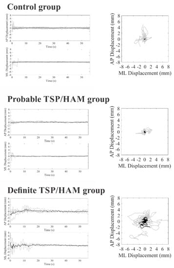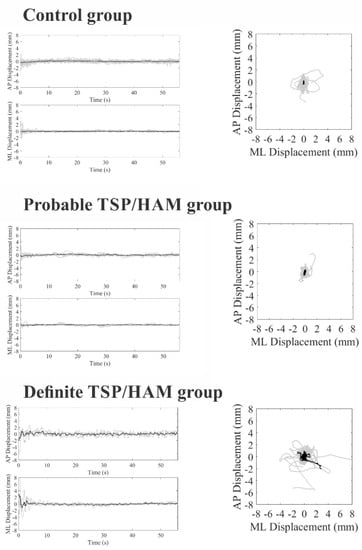 Figure 1 and Figure 2 show stabilometric recordings on the anteroposterior and mediolateral axes and statokinesiograms for the control group, the probable TSP/HAM group, and the definite TSP/HAM group for the open- and closed-eyes conditions, respectively.