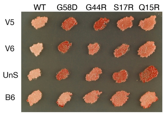 After experimenting with the 23 variants isolated from wild-type cells, I investigated whether there were still more variants that only stably propagated with Hsp104T160M, and if so, how they mutated in the wild-type cell. Sup35 overexpression in T160M cells was previously used to induce V2–V4 [26]. To increase the efficiency of discovery, Sup35(S17R) was used here to induce new [PSI+] variants as V2-V4 propagated less well with Sup35(S17R), thus unlikely to be excessively generated. The S17R mutant has been successfully used to induce the S17R* variant in the wild-type background previously, and it is capable of forming two novel amyloid structures in vitro [18,34]. The plasmid carrying Sup35(S17R) was removed after transient overexpression. Candidate [PSI+] colonies, now solely supported by the native Sup35 protein, were purified by repeated streaking. Two new variant types, named V5 and V6, were identified (Figure 1). They faithfully propagated in T160M cells (Table 2, yellow), but disappeared when cytoduced to wild-type cells. The majority of the V5 cytoductants propagated VK instead. In contrast, most of the V6 cytoductants lost [PSI+]; only a few VK colonies showed up (Table 1).