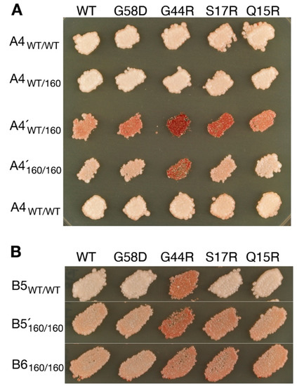 Different balances of cellular strengths in severing and trimming prion fibers can lead to the selection of distinct sets of [PSI+] variants [26,35]. The current investigation uncovered two mis-templating variants, namely A4 and B5, which appeared to propagate faithfully in wild-type cells because the structures they mis-templated were suppressed (Table 1 and Table 2, red variants). There were also transmutable variants propagating faithfully in T160M cells but revealing mis-templating propensities in wild-type cells, such as UnS and B6 as well as V5 and V6 (yellow variants in Table 1 and Table 2; Figure 1).