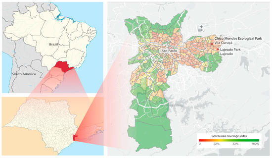 Left above: Map of Brazil with the state of São Paulo highlighted; Below: map of the state of São Paulo with the city of São Paulo highlighted. Right: Location of the Ecológico Chico Mendes and Lajeado-Izaura Pereira de Souza Franzolin urban parks (in the red circles), in the city of São Paulo, São Paulo state, Brazil.