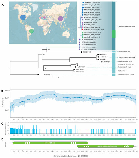 - Kubacki, J.; Flacio, E.; Qi, W.; Guidi, V.; Tonolla, M.; Fraefel, C. Viral Metagenomic Analysis of Aedes albopictus Mosquitos from Southern Switzerland. Viruses 2020, 12, 929. [Google Scholar] [CrossRef]