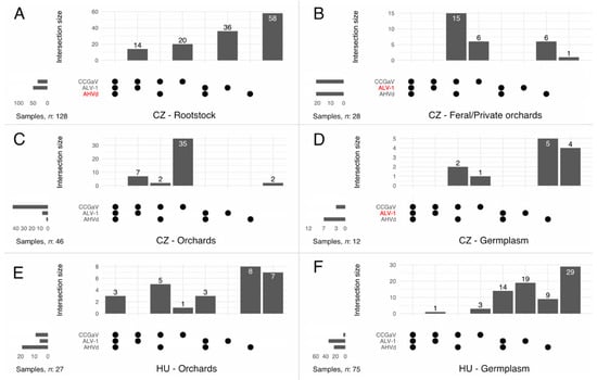 UpSet plots of apple hammerhead viroid (AHVd), apple luteovirus 1 (ALV-1), and citrus concave gum-associated virus (CCGaV) infections in the Czech (A–D) and Hungarian (E,F) samples uncovered by high-throughput sequencing and RT-PCR screening. Horizontal bars show the total number of viroid- or virus-positive cases. Vertical bars display the number of negative, single, and mixed infections. Pathogen names in red highlight the absence of positive cases. For example, panel A shows rootstock Czech samples, where AHVd was not detected. The total number of ALV-1 cases was higher than that of CCGaV cases (horizontal bars). Fourteen cases of mixed ALV-1/CCGaV infection were detected, while twenty and thirty-six samples were singly infected by CCGaV and ALV-1, respectively. Fifty-eight samples were tested as negatives.