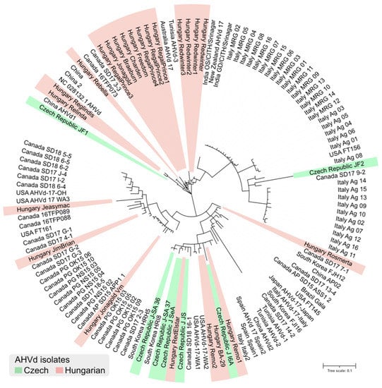 Phylogeny of AHVd isolates from the GenBank database and the current study. Czech and Hungarian isolates are highlighted. All branches with support less than 0.8 were collapsed.