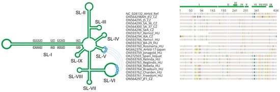 Residues involved in the kissing-loop interaction are the same as in the Chinese reference genome (enabling four interactions), except for one Czech isolate (JF2) (Figure 4). In this variant, similar to AHVd-IT-MRG_01, a deletion is present at stem-loop (SL)-V, but because of a further variation in the interacting SL-VI, interaction in this putative kissing-loop domain is possible through three base pairs [].