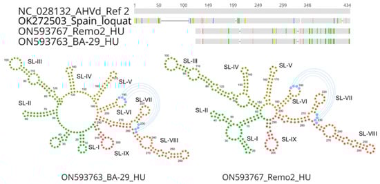 AHVd variants were 433–434 nt long, with the exception of Remo2 and BA-29, which were much shorter. In these 308 nt long variants, a 120 nt deletion in the Stem-Loop I (SL-I), the hammerhead-motif-containing part of the viroid genome, is present. Detailed investigation of the viroid sequences showed very high similarity within the stem-loop parts of the viroid genome (Figure 3).