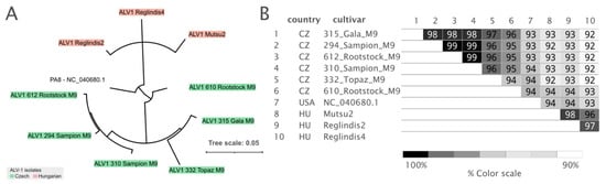 Nine nearly complete ALV-1 genomes were reconstructed. Sequence identity and phylogenetic analyses divided them into two groups (Figure 6), while the PA8 isolate was left as an outgroup. All Hungarian and Czech ALV-1 isolates clustered based on country. Notably, isolates M9-610 and M9-612, originating from the same batch of rootstock material, were separated on different tree branches (Figure 6A). The estimated nucleotide variability reached up to 8% (Figure 6B). Most changes were found in the ORF1 and ORF5 regions (Figure S4).