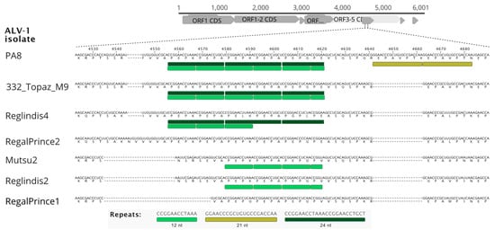 Interestingly, all of the indels were in-frame, without coding frame disruption of the P3-P5-encoded protein. The BLAST-based search of the insertion sequences against the GenBank database did not reveal any significant hits (Accessed on 20 May 2022; E-value cut-off 0.5). As there were noticeable repeats consisting of the PEPK/A motif in the translated sequence, we analysed all available ALV-1 sequences for the presence of tandem repeats (TRs). Repeats of three different lengths were found—12 nt, 21 nt, and 24 nt. Although the algorithm used identified 12 nt and 24 nt repeats as separate (Table S7), the 24 nt-long unit consisted of two 12 nt repeats (Figure 7; however, this unit was not completely identical within isolates (detailed alignment is shown in Figure S5). A further peculiarity is that the repeats were not found in all isolates. Remarkably, the PA8 isolate of ALV-1 had a unique two-copy repeat in the 4640–4682 region (Figure 7). While there were differences between the presence and number of TRs between isolates, the other source of nucleotide differences was several insertion/deletion events (Figure 7). While one indel was associated with the 21 nt repeat in the PA8 genome (Figure 7), the remaining TRs had no direct influence on the indels.