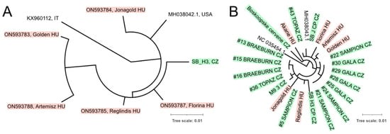 A total of 316 apple leaf samples were taken from production orchards and germplasm collections in the Czech Republic and Hungary, together with samples from feral/private orchards and imported rootstock material in the Czech Republic (Table A1, Table S1). The Czech leaf samples were processed with a GeneJET Plant RNA Purification Kit (Thermo Fisher, Waltham, MA, USA), and the extracted RNA was quantified and quality-controlled using a NanoDrop ND-1000 (Thermo Fisher). The Hungarian leaf samples collected from four different branches of the trees were used for RNA extraction by the CTAB method [].
