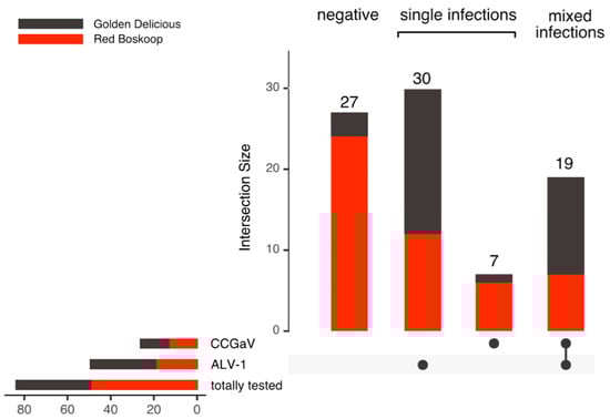 UpSet plot of infections in Red Boskoop (RB) and Golden Delicious (GD) scions grafted on M9 rootstocks. Horizontal bars show the total number of virus-positive cases. Vertical bars display the number of negative, single, and mixed infections.